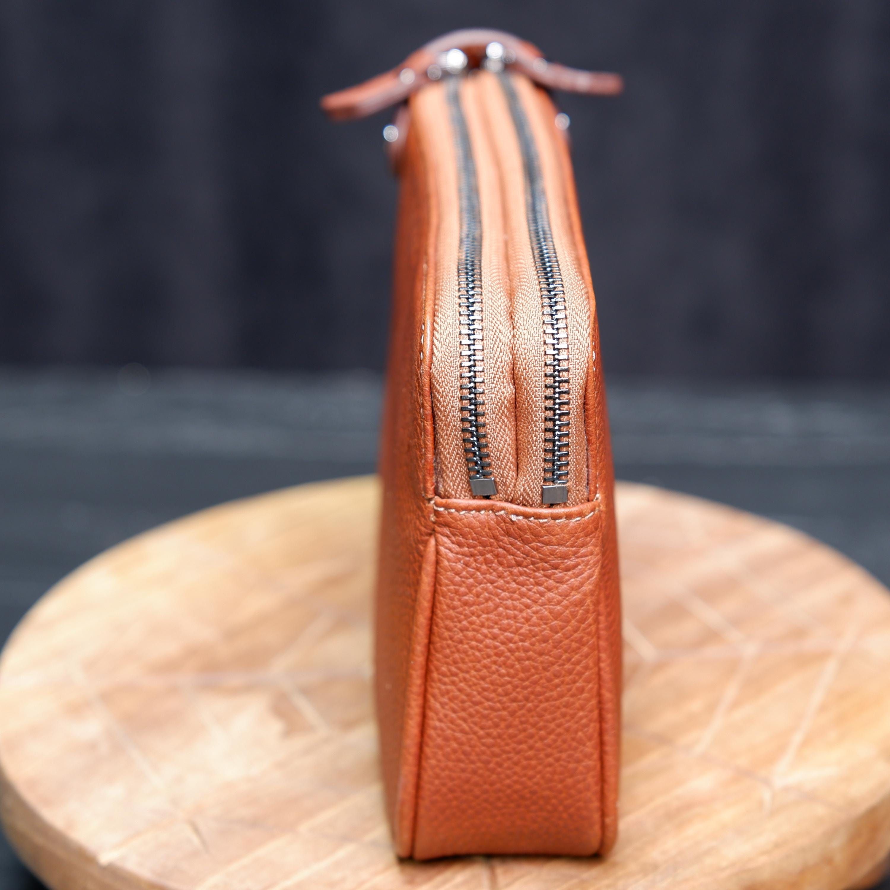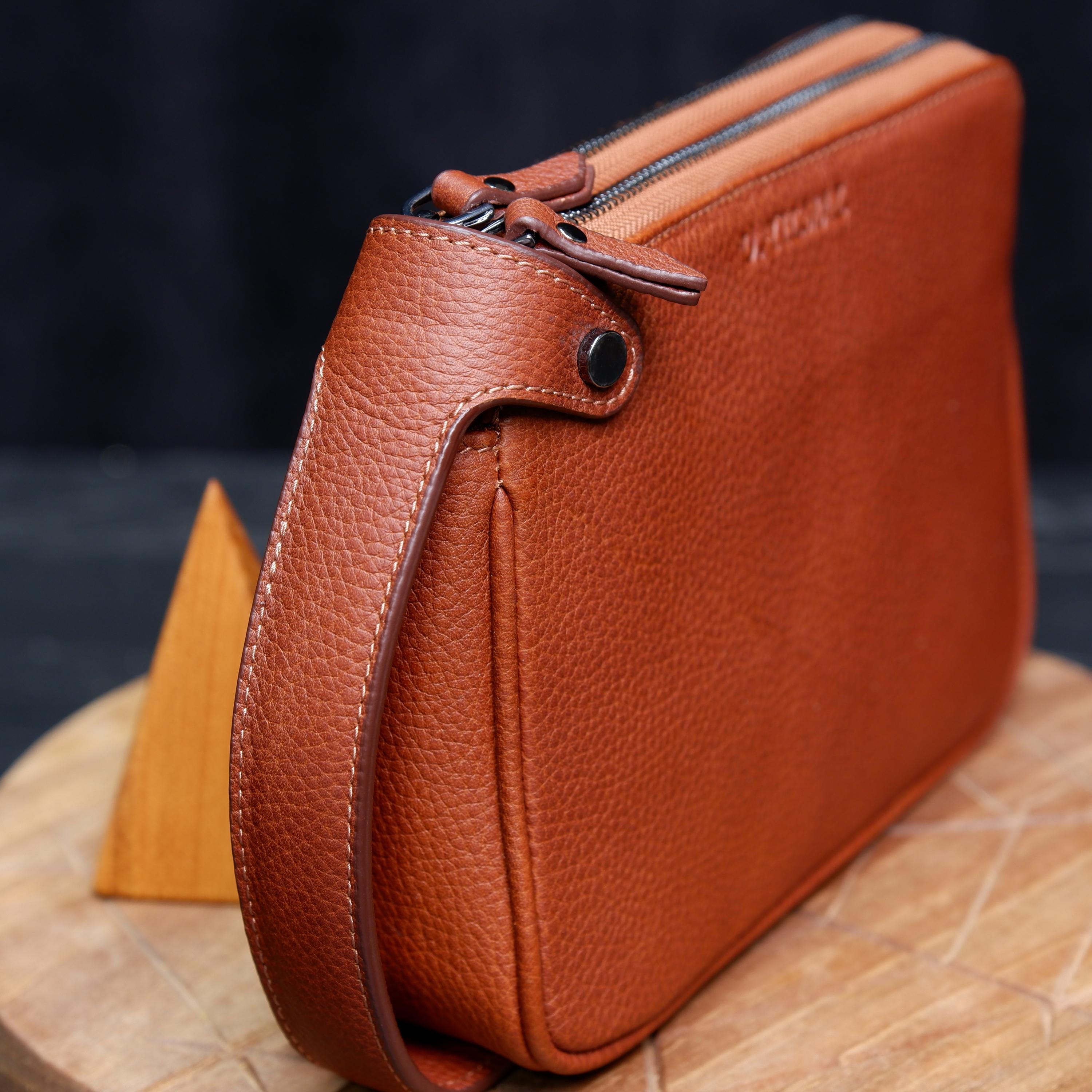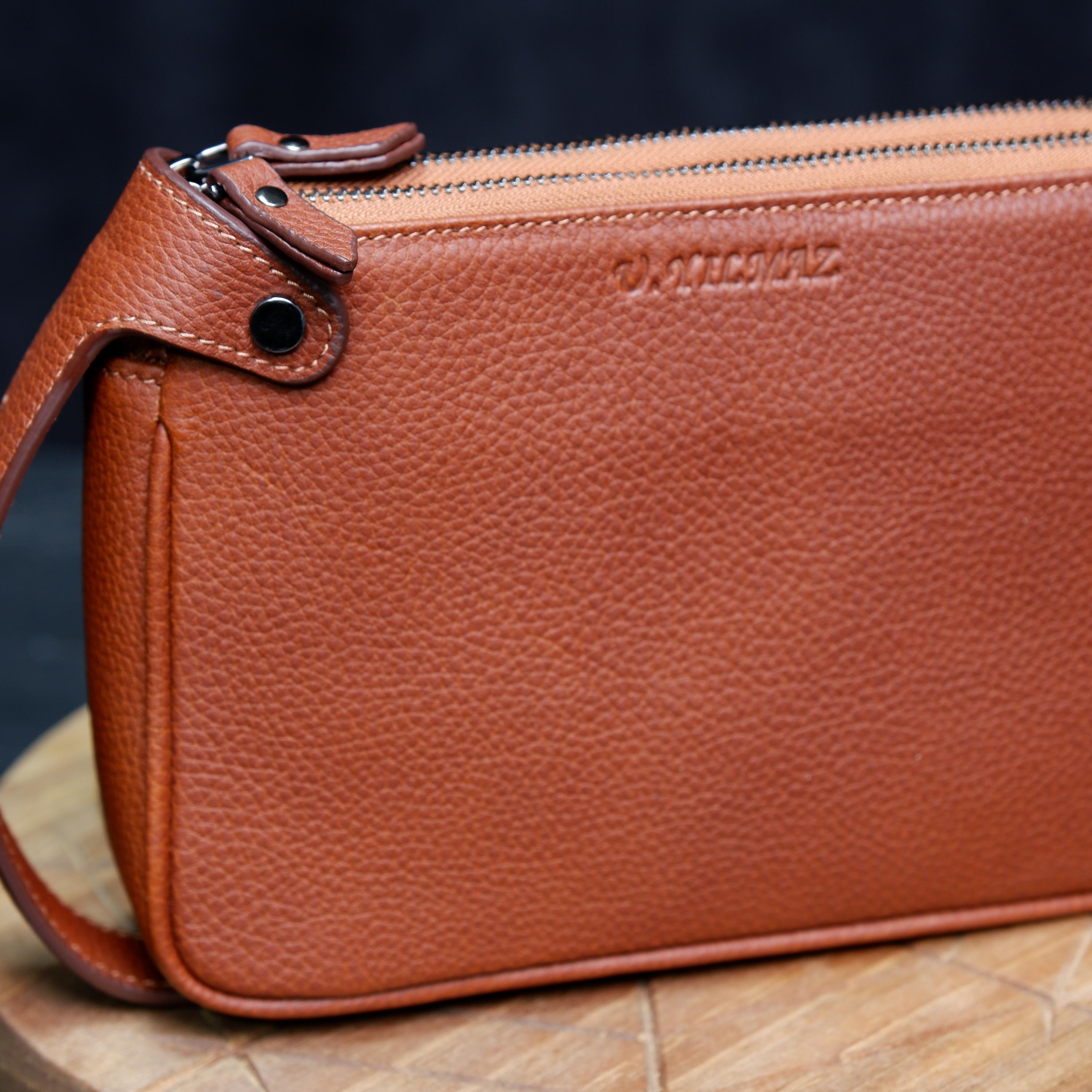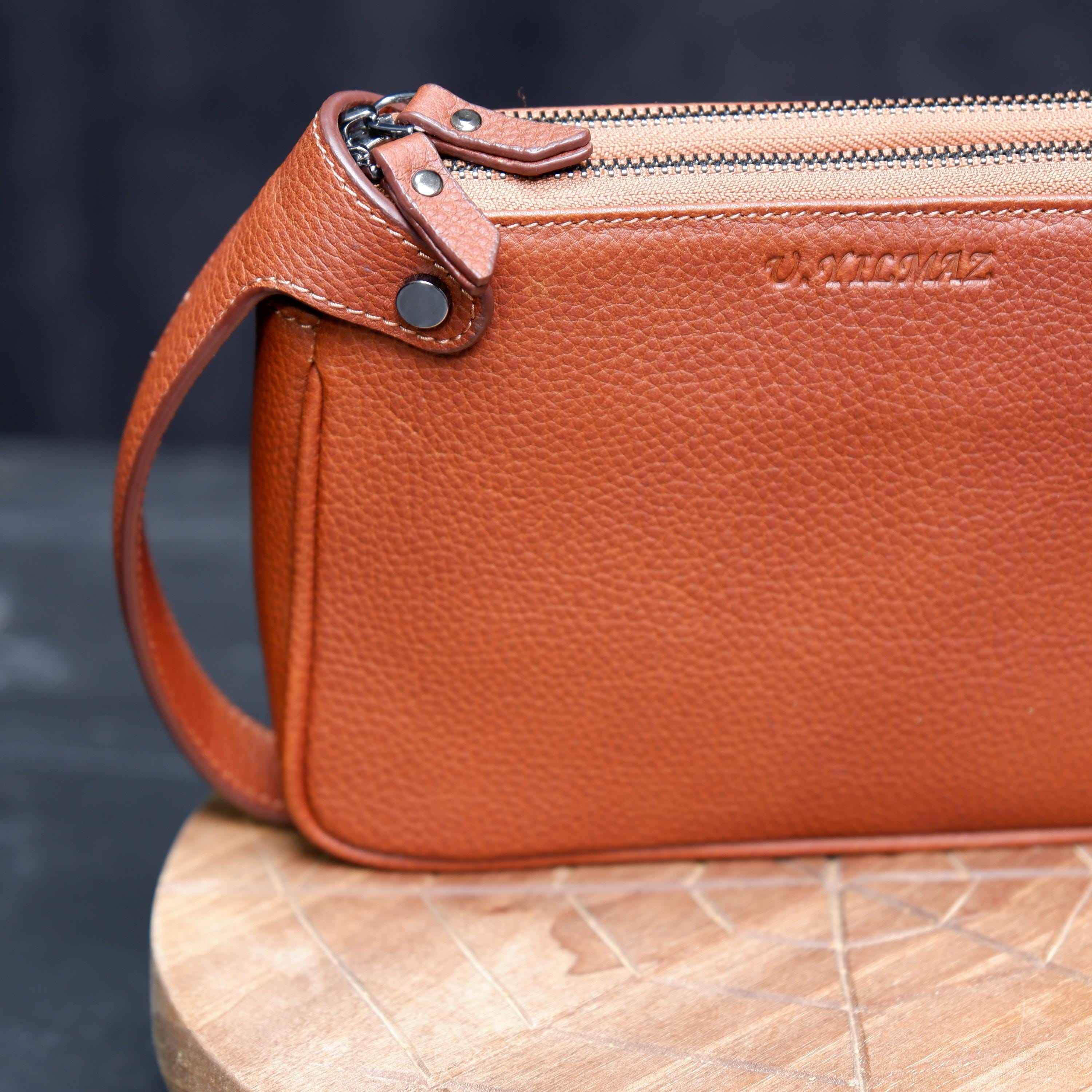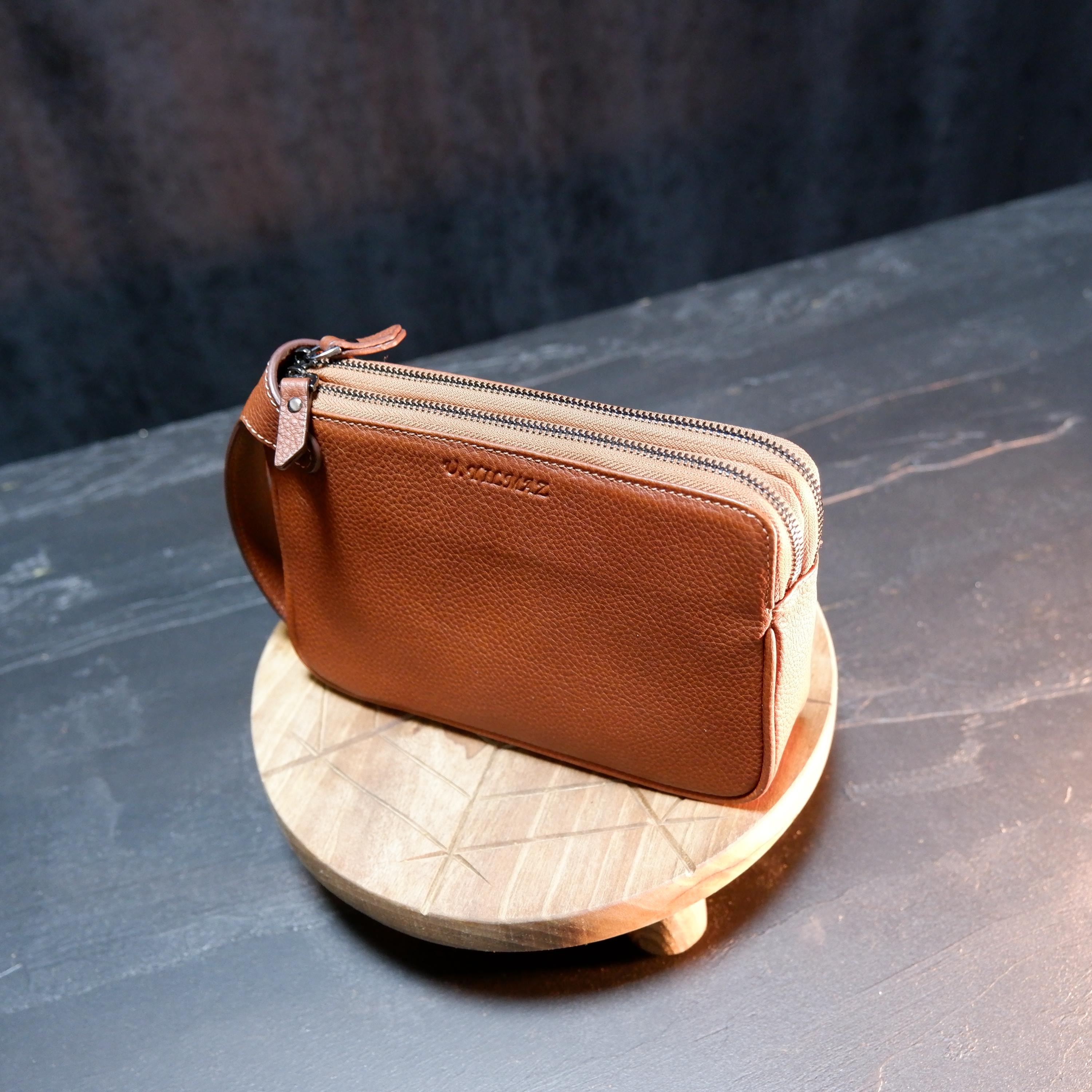 Designed for functionality, it features two separate zipper compartments, organized inner space, and a comfortable leather wrist handle for easy carrying. The natural pebbled leather grows more beautiful over time, developing a unique patina with every use.