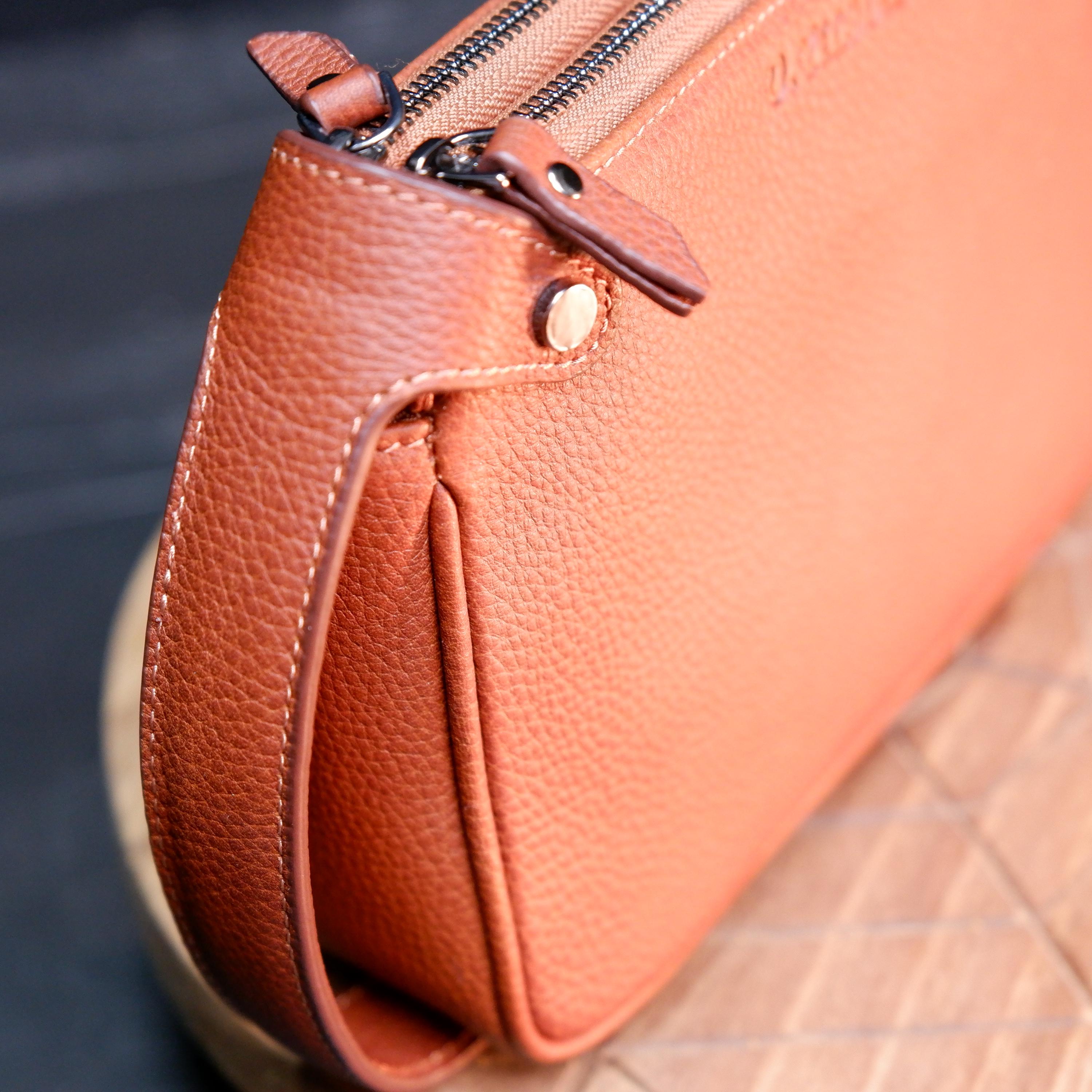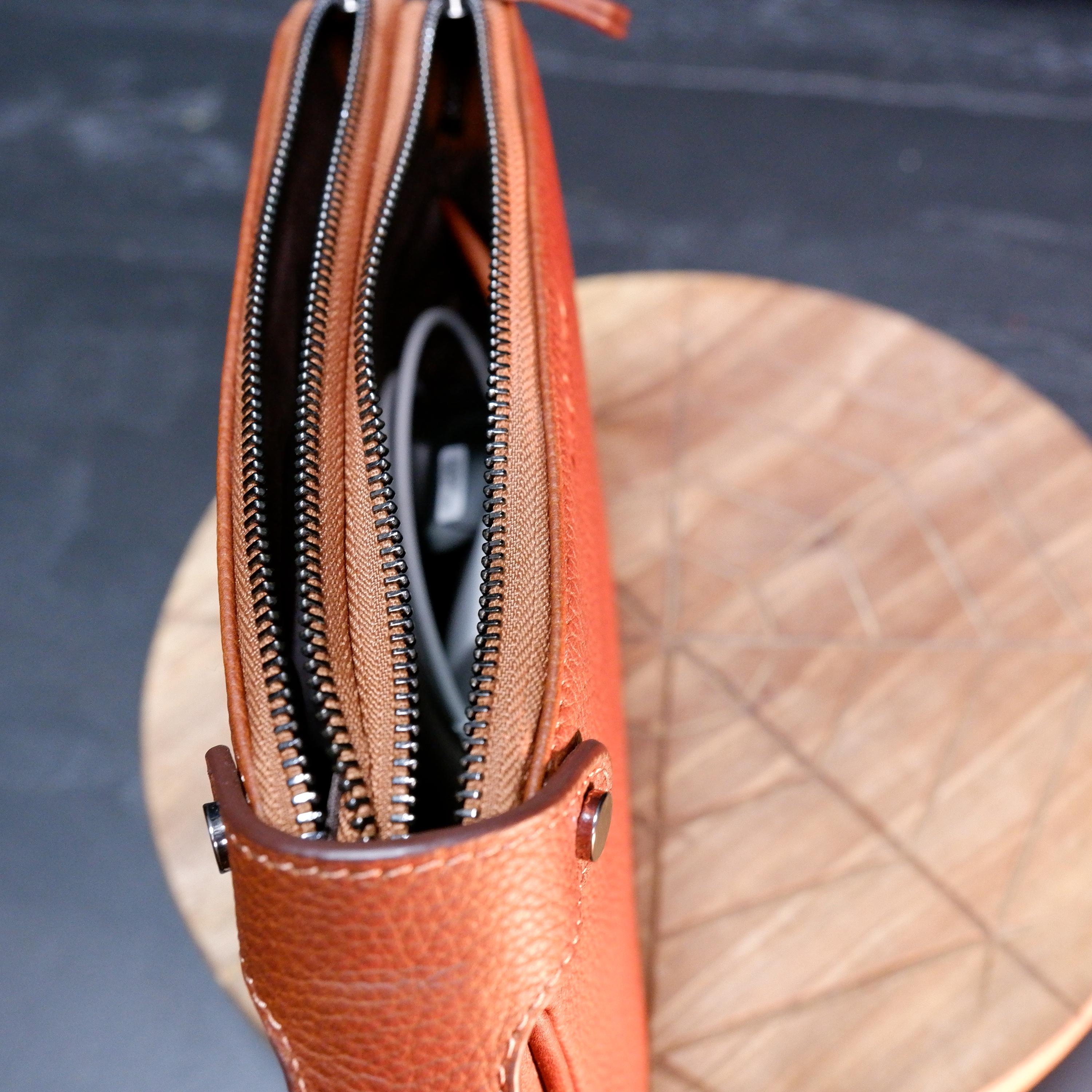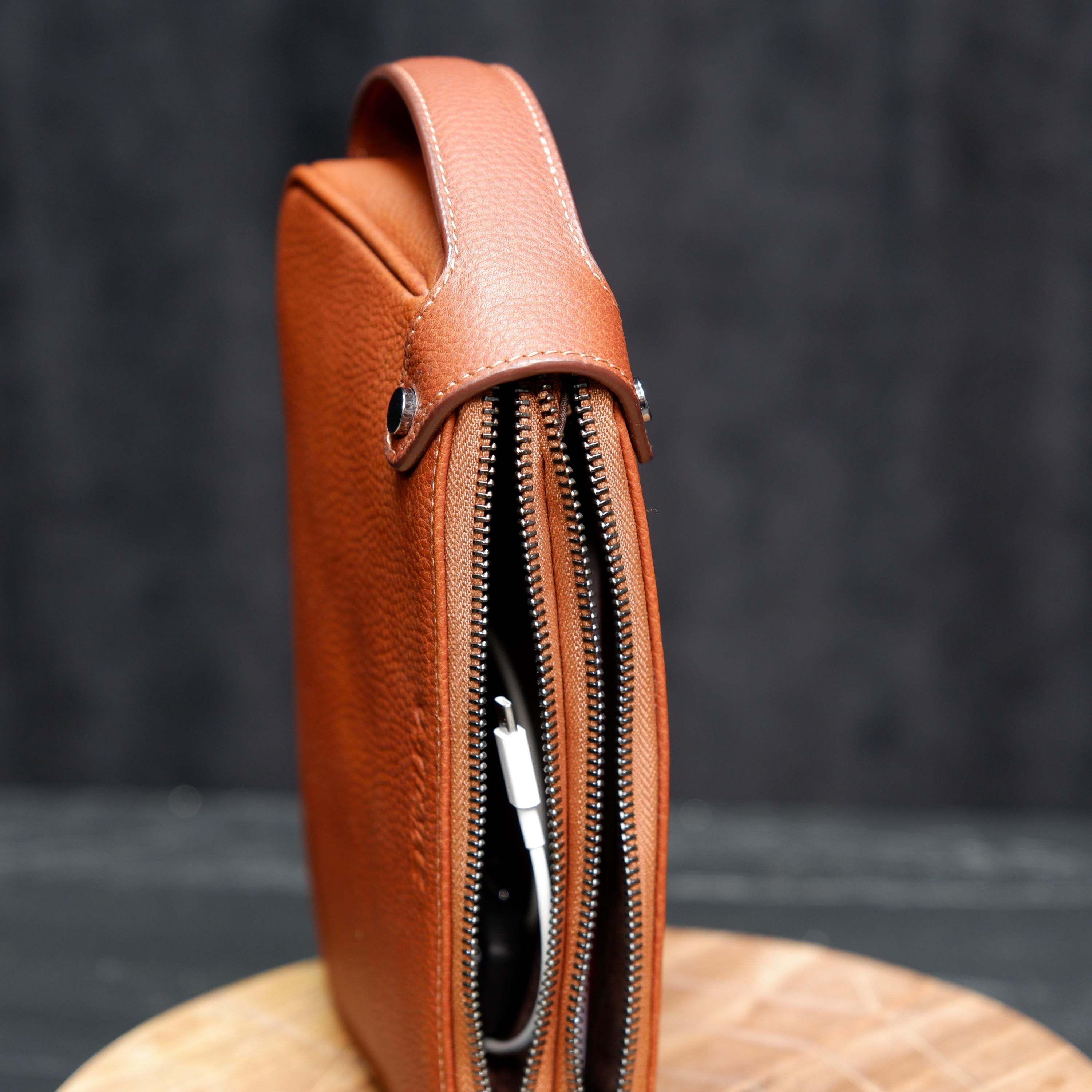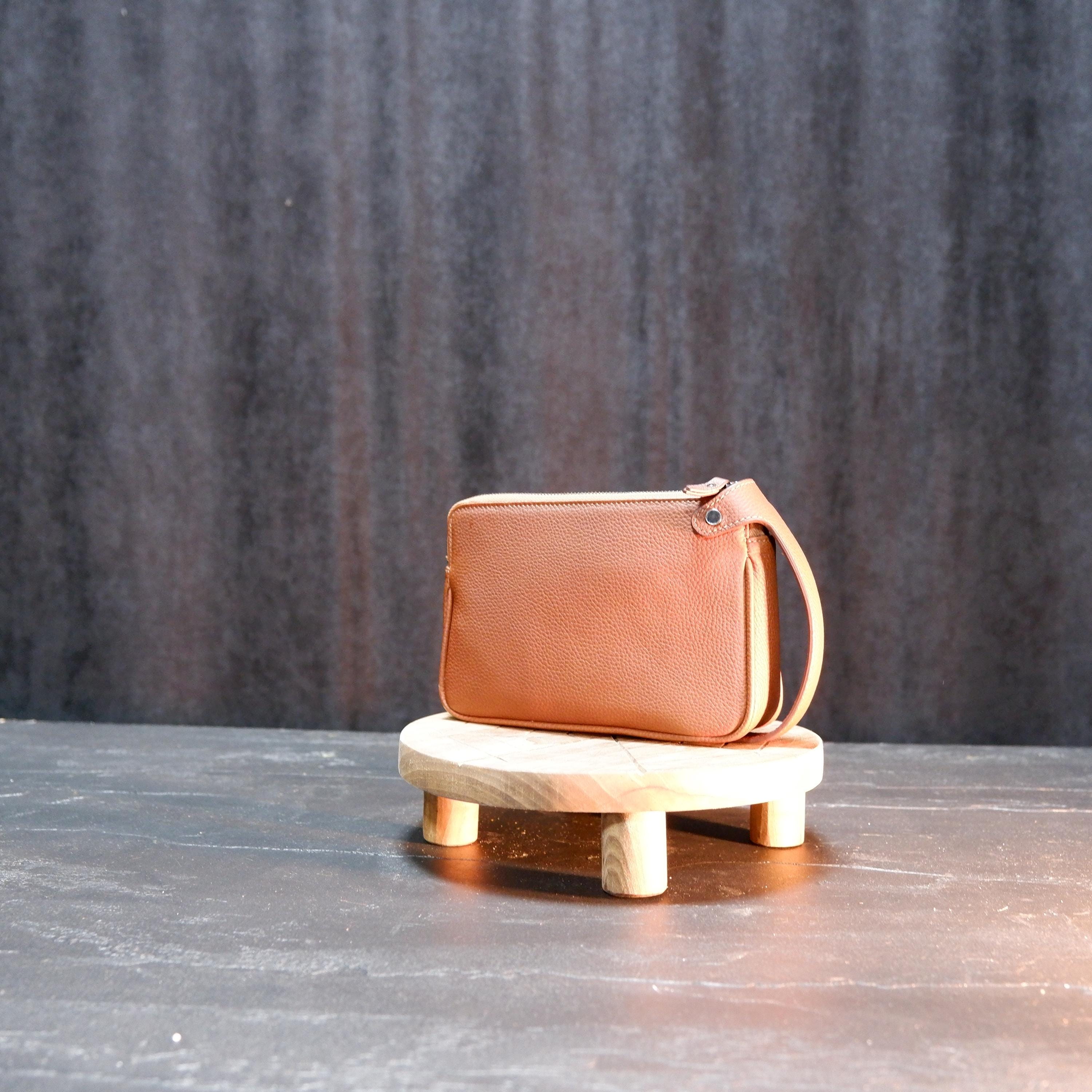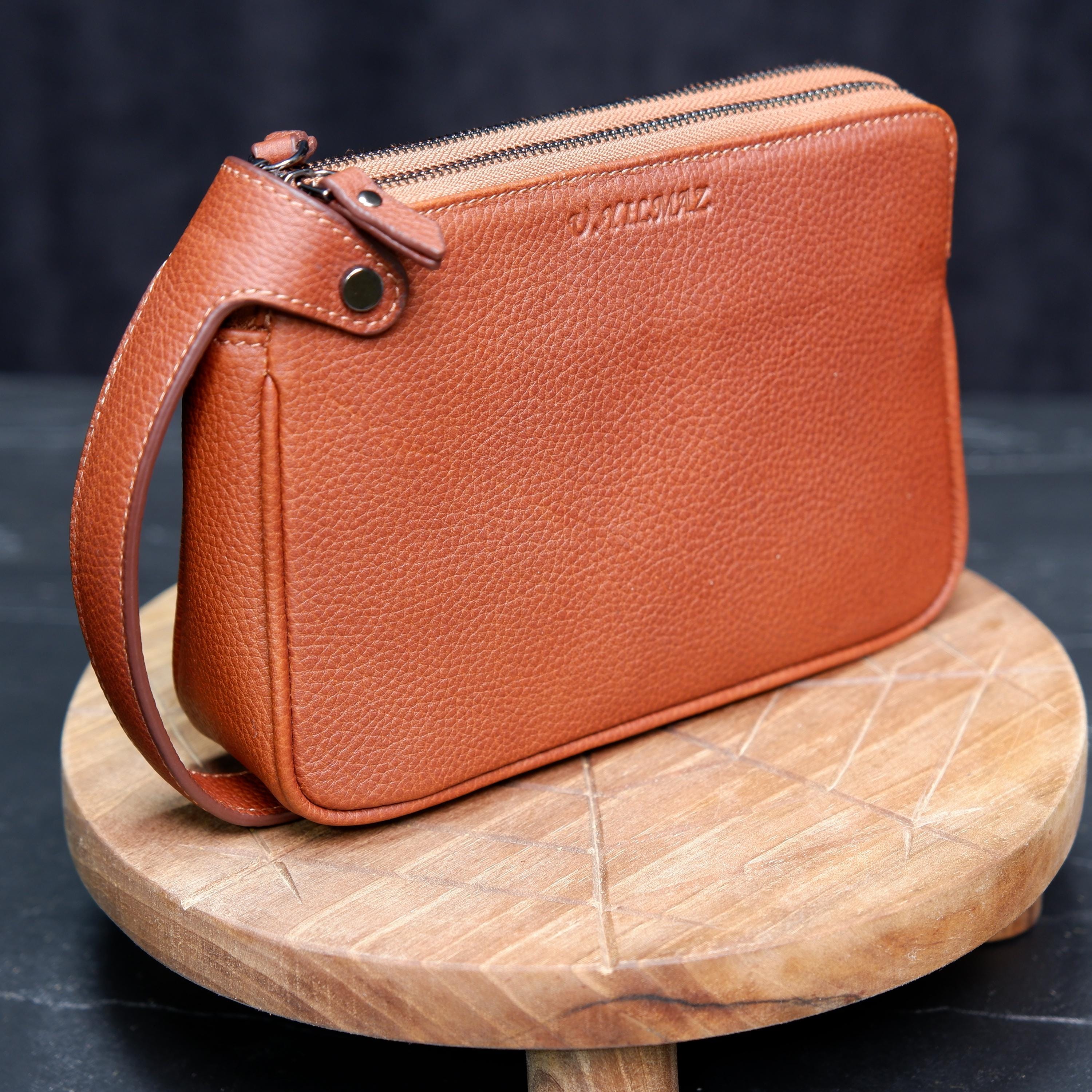 Designed for functionality, it features two separate zipper compartments, organized inner space, and a comfortable leather wrist handle for easy carrying. The natural pebbled leather grows more beautiful over time, developing a unique patina with every use.