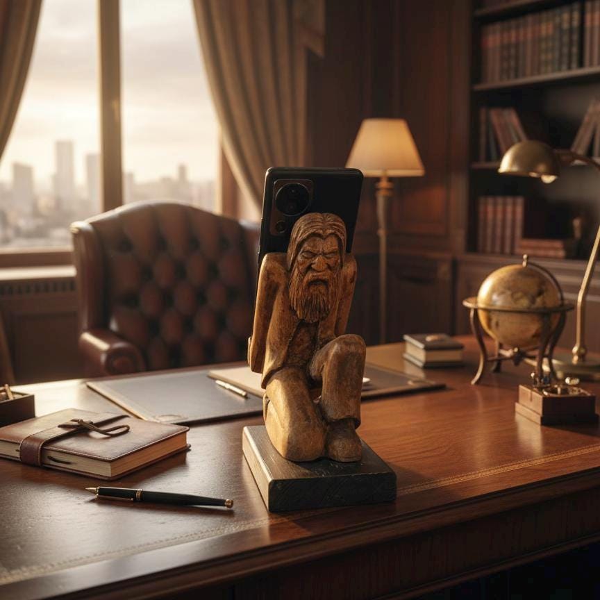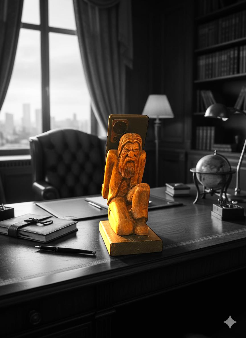 Named 'Wooden Elder and Smartphone Stand: Contemplating the Burden of Technology,' this exceptional artwork prompts thought and discussion while offering an exquisite aesthetic. Custom-made and infused with the love and labor of handcrafting, this piece embraces both technology and the artistry it brings. It will grace your home with visual splendor while securely cradling your smartphone.